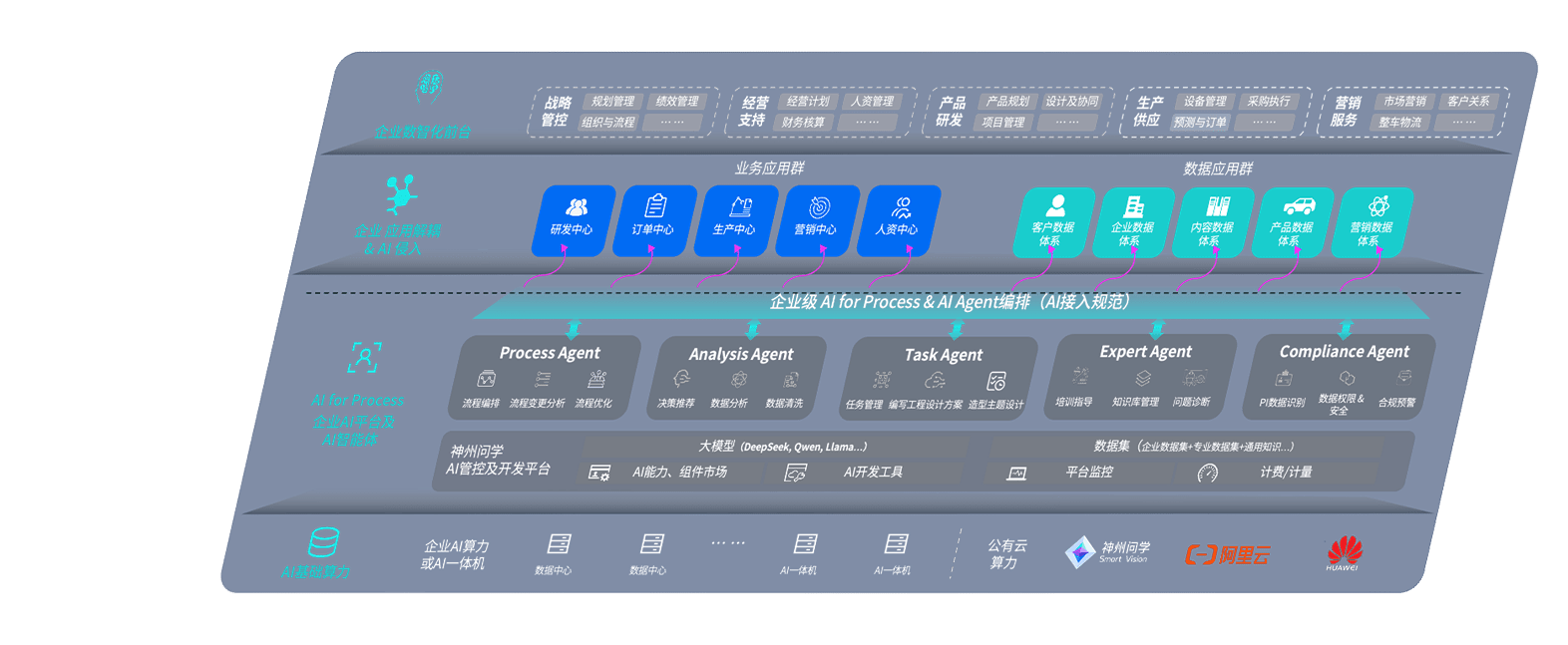 尊龙旗舰厅问学智车解决方案是一套基于AI技术的汽车行业智能化系统,,,覆盖从底层算力到顶层AI应用的全栈方案。。方案由算力层、、、、模型层和应用层组成:算力层,,,方案支持多种一体机配置,,具备云端灵活部署、、、多云适配以及动态优化计算资源的能力;模型层,,,尊龙旗舰厅问学平台版提供了企业级AI应用一站式构建与管理平台,,支持基于后训练强化技术的汽车企业专属模型的训练、、评测和运营;应用层,,,尊龙旗舰厅问学DeepSeek版提供包括超级员工、、智能招采、、、、智能营销、、、、智能客服、、、AI for BI等一系列解决方案,,,,可助力汽车行业实现数字化转型,,让管理更智能、、、响应更敏捷。。。