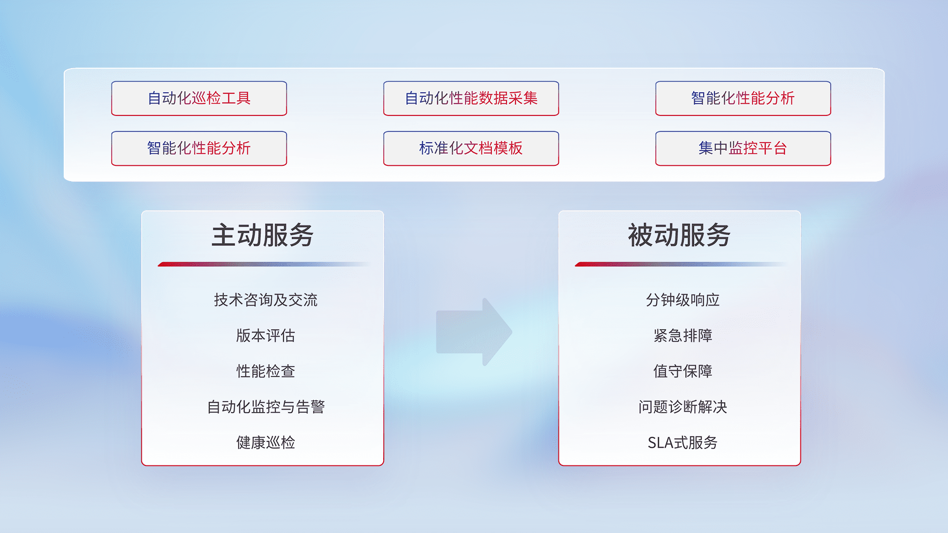 智能化工具和标准化文档,,保障服务质量,,,提供主动服务(包含技术咨询、、、版本评估、、性能检查、、、、自动化监控与告警、、健康巡检)和被动服务包含(分钟级响应、、、紧急排障、、值守保障、、、、问题诊断解决、、SLA服务)。。。